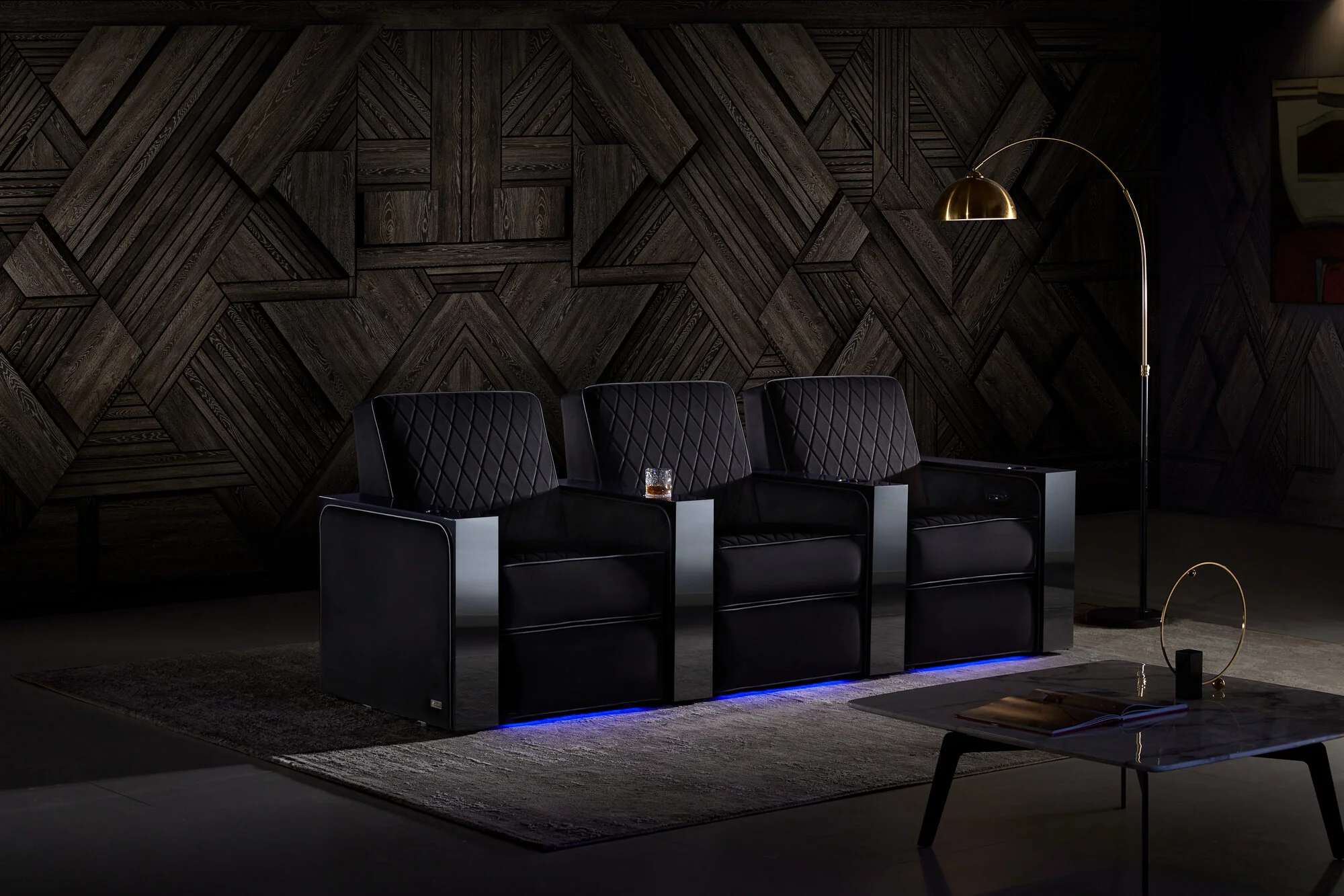 Experience the grandeur and timelessness of Valencia’s Naples Prestige, a media room recliner upholstered in premium velour fabric. Our Naples Prestige is perhaps one of our most luxurious home theater recliners yet. Reflecting the precision and balance of an orchestra, Naples Prestige is designed with sleek Piano Black Wood armrests and upholstered with rich Raven Parisian Velour to mirror the refinement of a Grand Piano. The lusciousness of the Parisian Velour is enhanced with Diamond Stitching to intensify comfort. Featuring Leather piping, this seat exudes a posh, minimalist elegance.