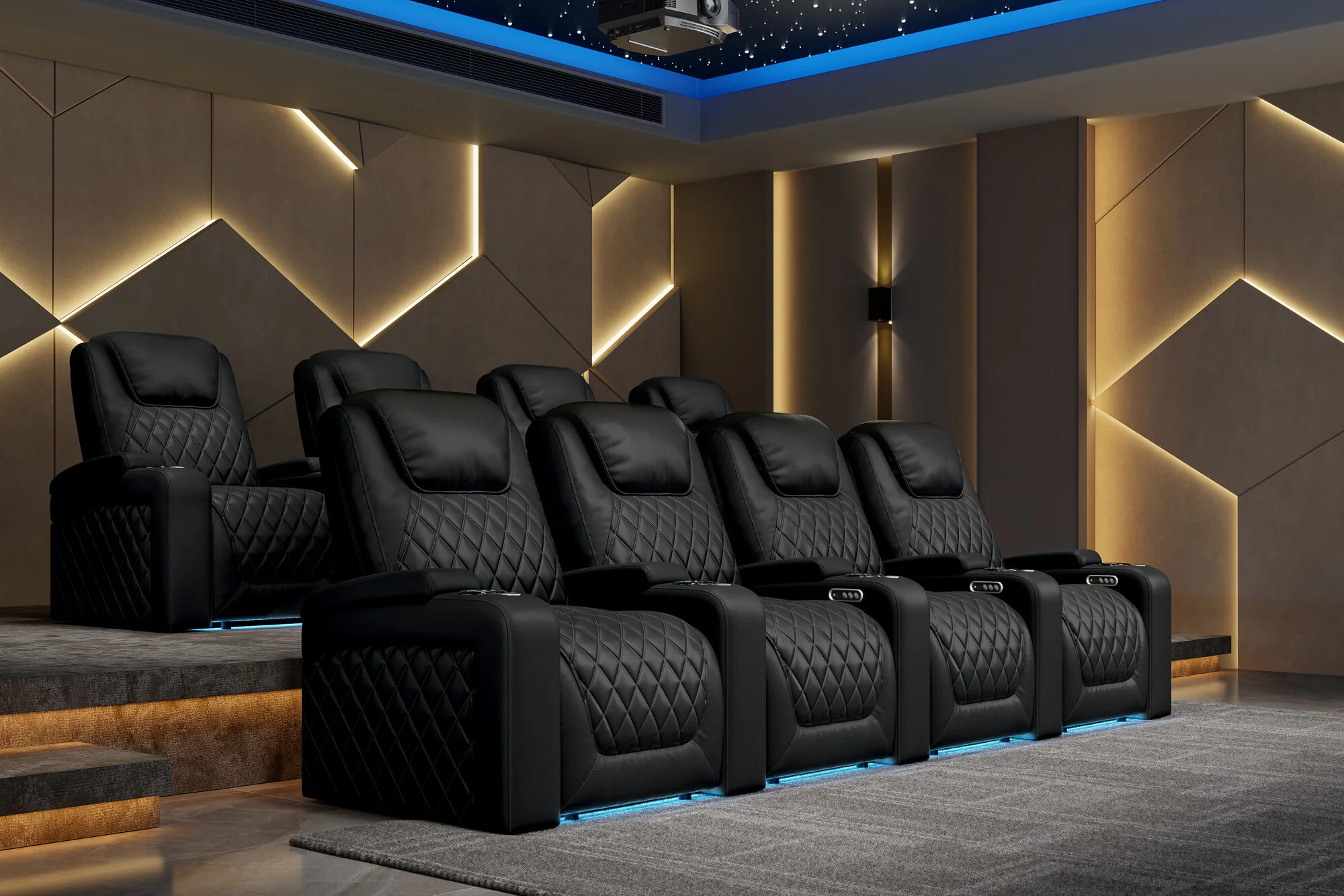 Introducing the XL Version of Oslo Home Theater Seating! Upgrade your home theater with the brand new Oslo XL with upgraded technology and cutting-edge comfort, A perfect blend of luxury, style, and comfort. Enjoy immersive movie nights with new RGB cup holders with ambient base lighting, and a motorized reclining system that lets you find your perfect seating position effortlessly. This premium recliner is crafted with new imported Italian Nappa 11,000 Top Grain Leather on all seating surfaces, offering a smooth and elegant touch.