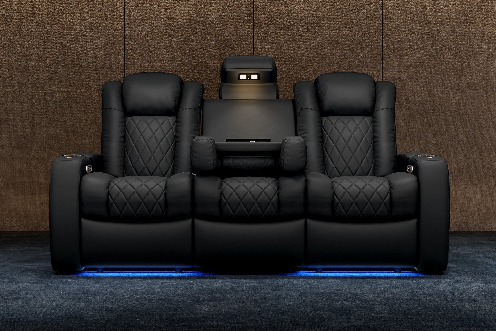 Combining design and function, the Tuscany XL Console provides luxury through its supple Italian Nappa 11,000 Top Grain Leather, cozy cushions, supportive headrest and a middle non-recliner center console that holds your favorite glass of wine and food platter. Both the left and right end seats are full power recliners with power lumbar and headrest adjustability. Customization is possible so tailor as you see fit and enjoy the ultimate home theater experience with the Tuscany Console.