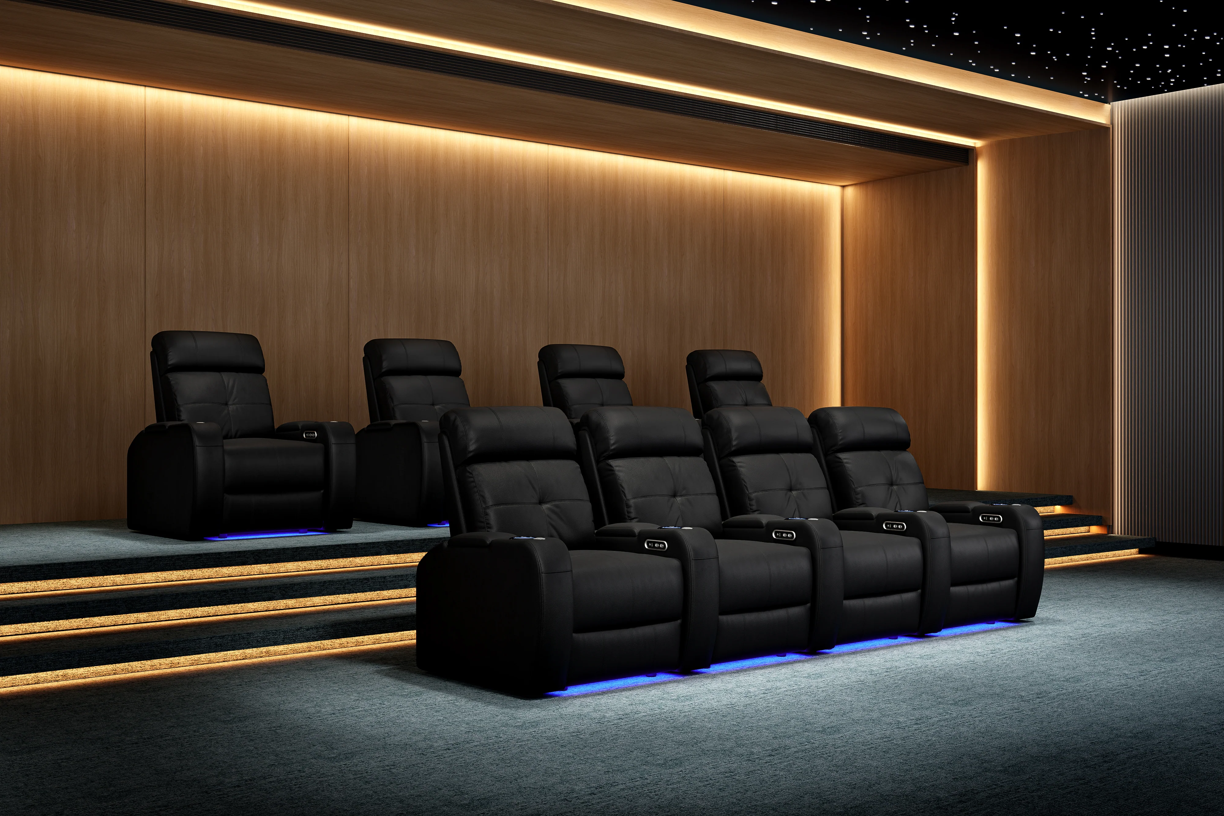The best in ergonomics, luxury and comfort, the newly upgraded Verona's elegance offers a truly unique home theatre experience for every occasion. With LED cup-holders and ambient base lighting, premium Italian Nappa 9,000 Top Grain Leather on all sitting surfaces, a USB outlet, and motorized recliner mechanisms, the newly upgraded Verona will create a memorable home theatre experience every time.
